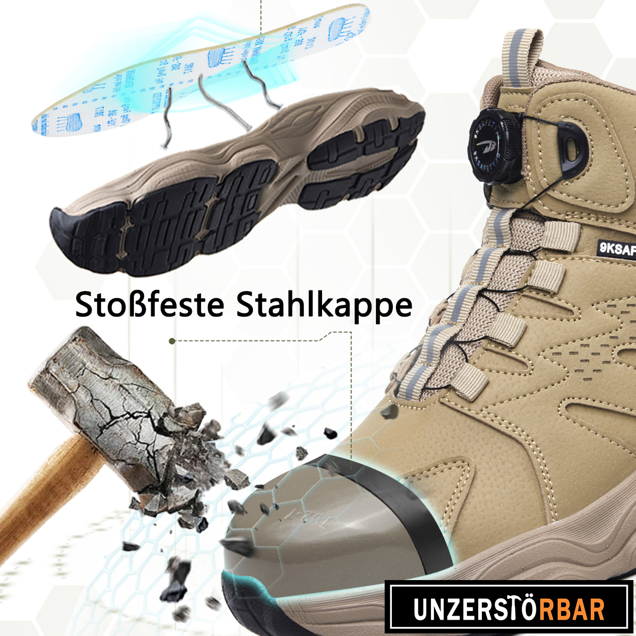Eingebaute, verbreiterte und verdickte Standard-Stahlkappe für ein Maximum an Schutz und zertifizierter Sicherheit.